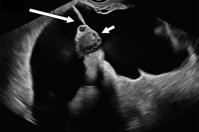 超声图像:右侧盆腔积液无占位效应,与邻近盆腔器官相符;悬垂于内的卵巢(短箭头);和代表粘连的分隔(长箭头)。